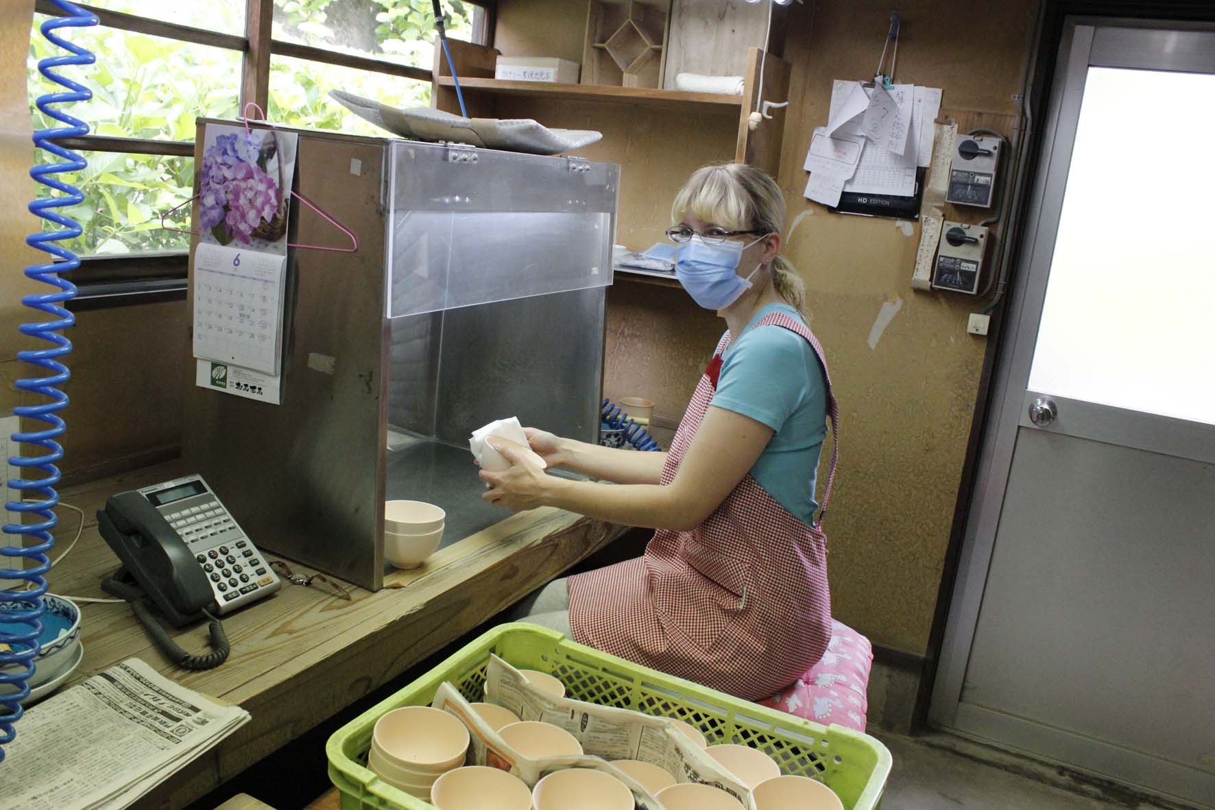 私はまず、素焼きの検品作業を体験することになりました。この作業は、焼きあがった磁器に割れ発生の有無を確かめて、下絵付けができるように埃を取り除くものです。