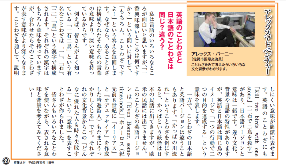 10 Published February 3, 2015 at 1000 × 580 in 2013 Saga City Newsletter Articles – 2013年市報さがの記事 ← Previous Next → 10月1日号ー「英語のことわざと日本語のことわざは同じ?違う?」 Discover more from Saga JET Programme Subscribe to get the latest posts sent to your email. Type your email… Subscribe