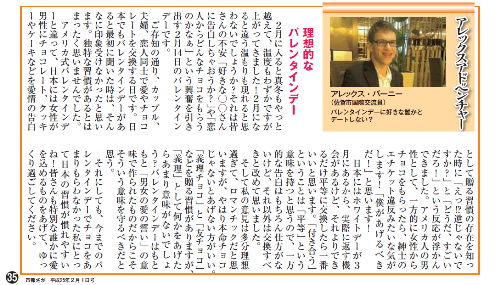 2 Published February 3, 2015 at 1000 × 576 in 2013 Saga City Newsletter Articles – 2013年市報さがの記事 ← Previous Next → 2月1日号ー「理想的なバレンタインデー」 Discover more from Saga JET Programme Subscribe to get the latest posts sent to your email. Type your email… Subscribe
