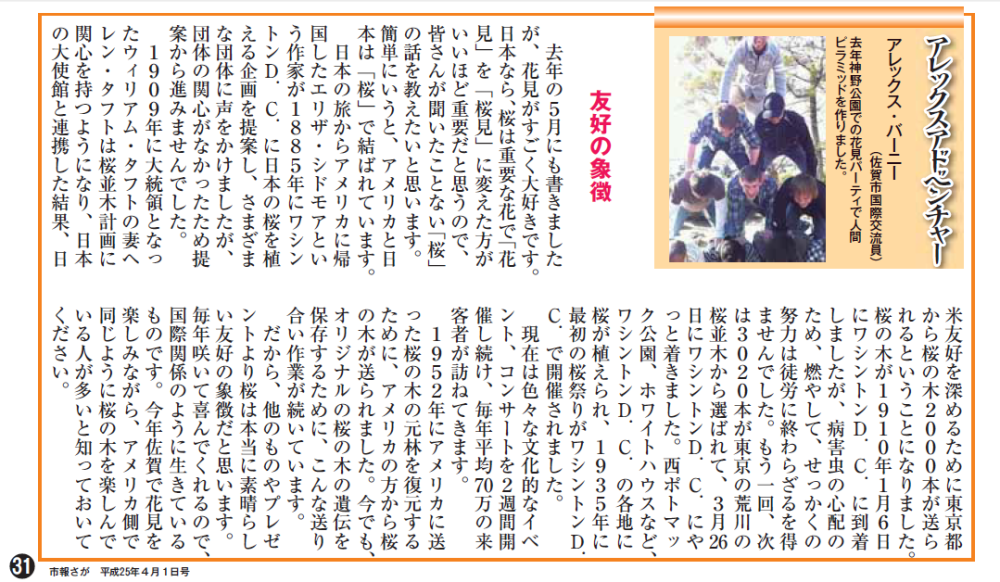 4 Published February 3, 2015 at 1000 × 582 in 2013 Saga City Newsletter Articles – 2013年市報さがの記事 ← Previous Next → 4月1日号ー「友好の象徴」 Discover more from Saga JET Programme Subscribe to get the latest posts sent to your email. Type your email… Subscribe