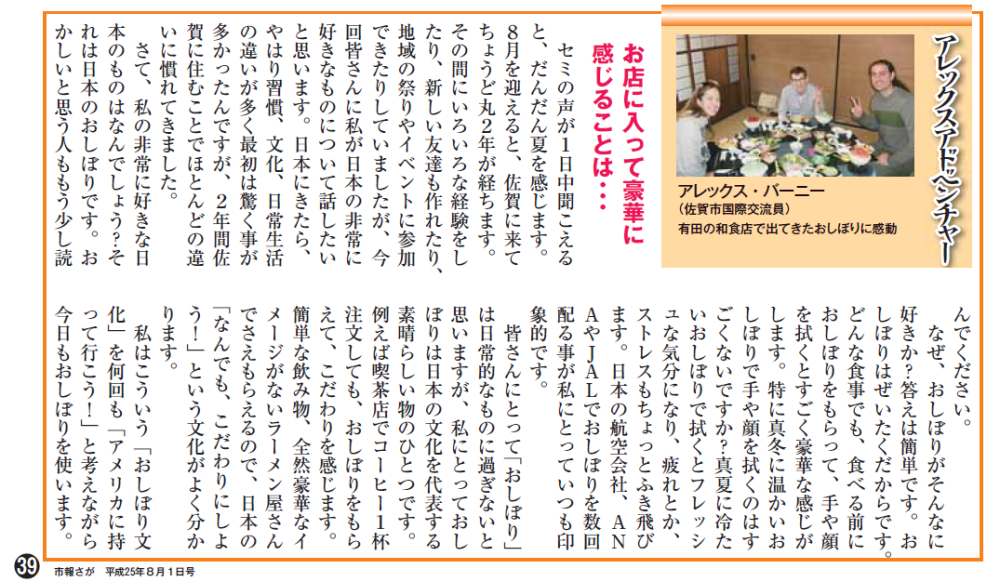 8 Published February 3, 2015 at 1000 × 582 in 2013 Saga City Newsletter Articles – 2013年市報さがの記事 ← Previous Next → 8月1日号ー「お店に入って豪華に感じることは・・・」 Discover more from Saga JET Programme Subscribe to get the latest posts sent to your email. Type your email… Subscribe