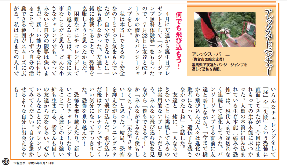 9 Published February 3, 2015 at 1000 × 578 in 2013 Saga City Newsletter Articles – 2013年市報さがの記事 ← Previous Next → 9月1日号ー「何でも飛び込もう!」 Discover more from Saga JET Programme Subscribe to get the latest posts sent to your email. Type your email… Subscribe