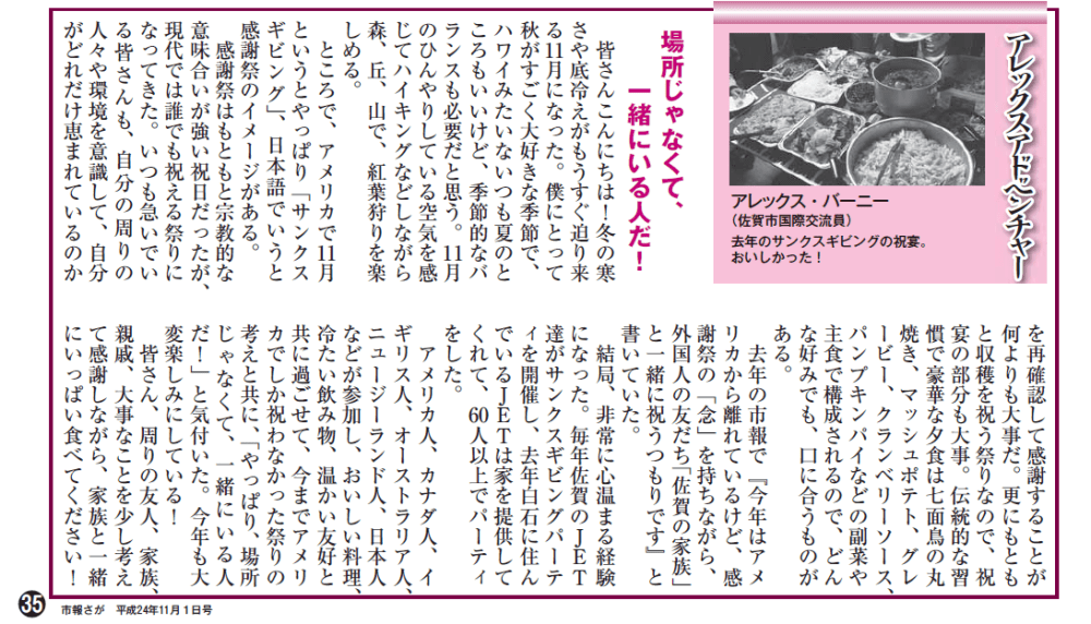 11 Published February 3, 2015 at 1000 × 572 in 2012 Saga City Newsletter Articles – 2012年市報さがの記事 ← Previous Next → 11月1日号ー「場所じゃなくて、一緒にいる人だ!」 Discover more from Saga JET Programme Subscribe to get the latest posts sent to your email. Type your email… Subscribe