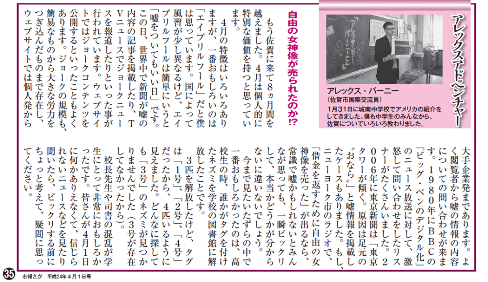 4 Published February 3, 2015 at 1000 × 579 in 2012 Saga City Newsletter Articles – 2012年市報さがの記事 ← Previous Next → 4月1日号ー「自由の女神像が売られたのか!?」 Discover more from Saga JET Programme Subscribe to get the latest posts sent to your email. Type your email… Subscribe