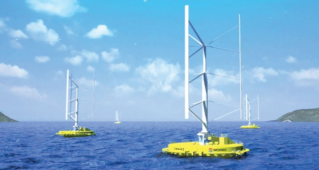 The machine — which matches a three-bladed vertical-axis wind turbine (VAWT) with a Savonius ocean-current turbine — is now installed off the coast of Yobuko, Saga prefecture, west of the city of Fukuoka.