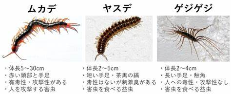 Mukade (5-30cm long, red head and feet), Millipede (2-5cm long, short legs and brown colour), Gejigeji (2-4cm long, very long legs, square angle to the legs)