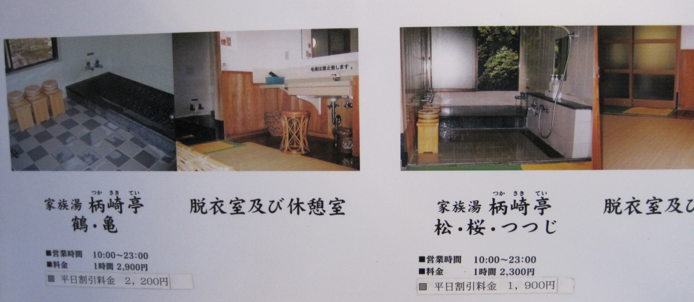 The third bathhouse has four private rooms/baths for hire (see pics below), ranging from 1,900 yen (2,300 yen on weekends) to 3,300 (weekend 3,800) per hour. Baths are hot (maybe 45 degrees) but can be cooled with a cold water tap. Open from 10am – 11pm.