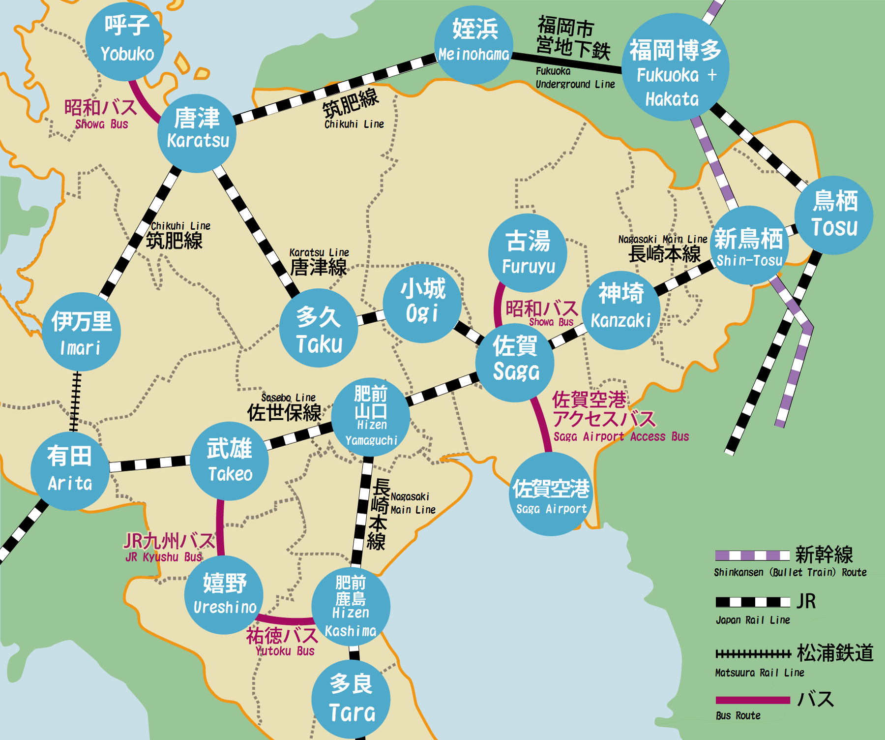 Saga is isolated from the kyushu shinkansen – your routes are either between Nagasaki and Takeo-Onsen, or both south to Kagoshima or West to Fukuoka/ mainland Japan via Shin Tosu Station.
